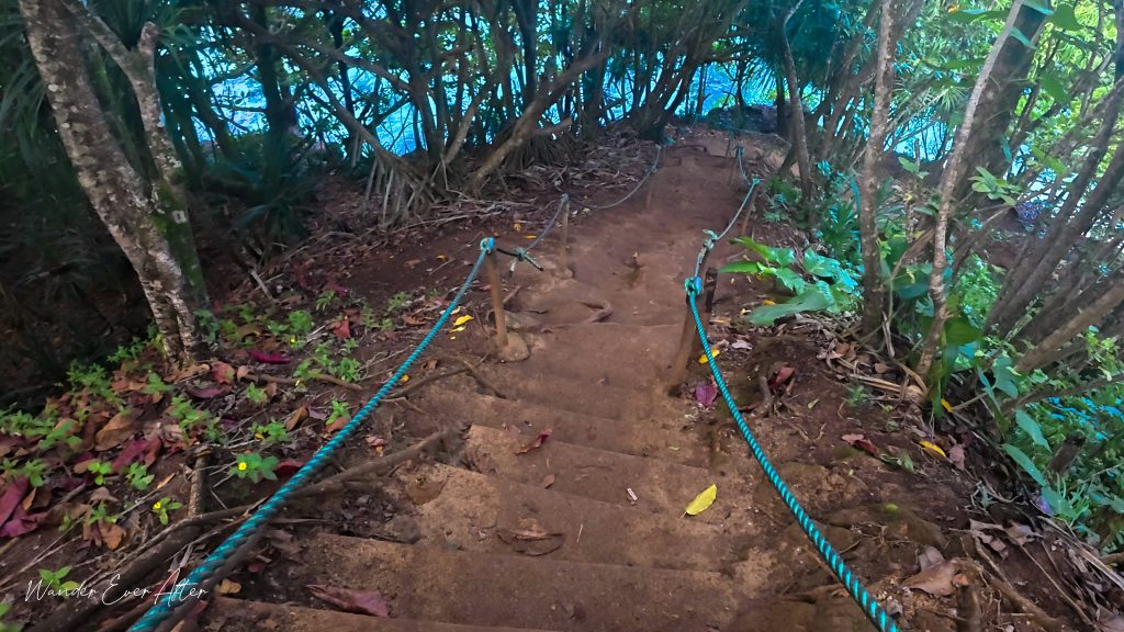 - The middle section requires holding onto ropes strung along trees and poles to steady yourself. Roots act as natural steps, but they can be slippery when wet. You’ll see the beach once you get down past the roped section.